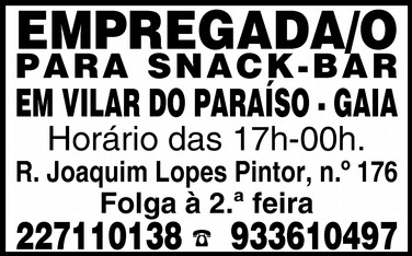 EMPREGADA/O PARA SNACK-BAR EM VILAR DO PARAÍSO - GAIA 17.02.11, Planeta Cultural Faça uma visita à fonte da informação clicando aqui Tweetar Tags:economiaemprego link comentar favorito